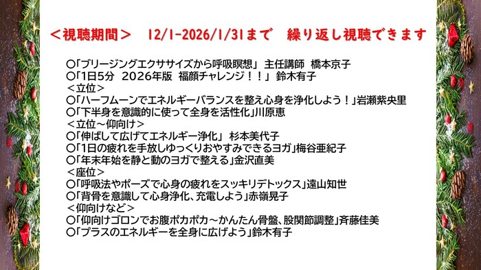 内容:<視聴期間> 12/1~1/31 まで 繰り返し視聴できます